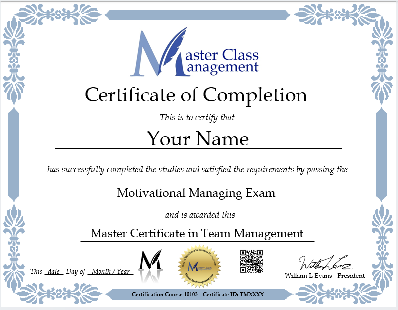 The "Master Certificate in Team Management" will be in your name and sent to you in soft copy PDF format by e-mail within 24 hours (on average within an hour) for $19.99 USD. The optional hard copy is $39.99 USD and optional PDF and hard copy is $49.99 USD (available only in the USA with Free shipping and should arrive within 2 to 5 business days).